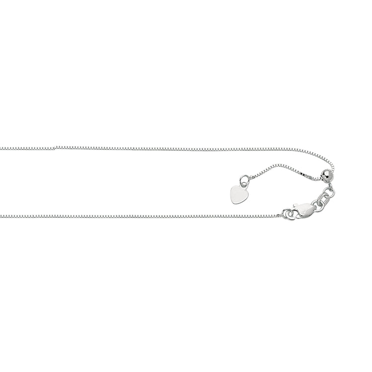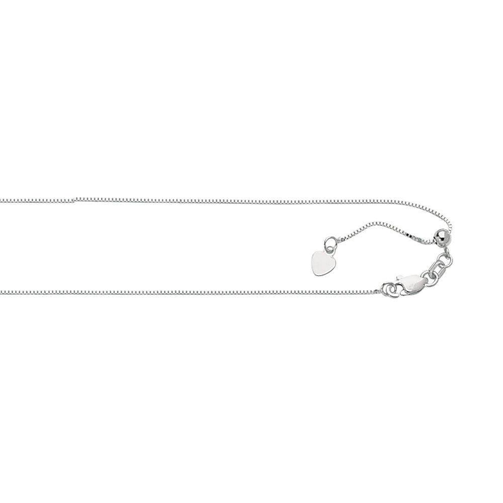 Description | 10K White Gold 0.68mm Adjustable (adjusts up to 22 inches) Box 22" Chain with Lobster Lock |