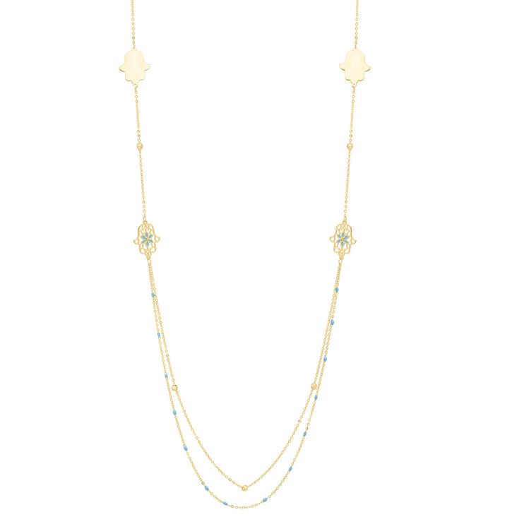 Description | 14K Yellow Gold Long Hamsa Stationed 30" Necklace with Pear Shaped Lobster Clasp & Enamel Accents |