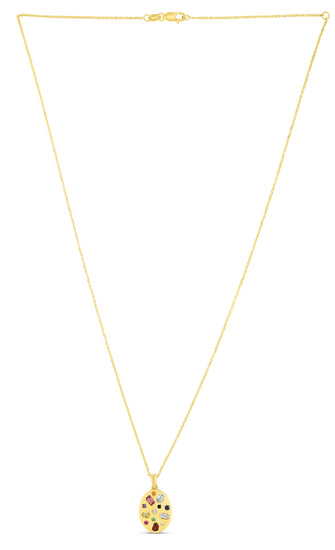| Description | 14K Yellow Gold Gemstone Inlay Oval 18" Necklace with Lobster Clasp.   Stones include .02ct Diamonds, Citrine, Blue Topaz, Pink Tourmaline, Ruby, Garnet, Sapphire, Aquamarine, Peridot, Amethyst, Emerald & Black Spinel. |