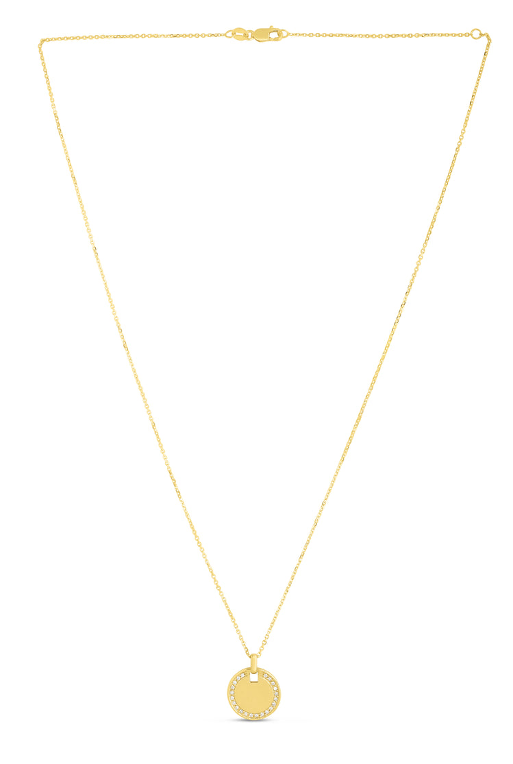 | Description | 14K Yellow Gold .10ct Diamond Round Disc Tag 18" Necklace with Lobster Clasp. |