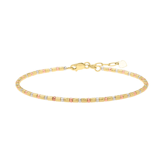 | Description | 14K Gold Tri-Color Diamond Cut Bead 7" Bracelet with Pear Shaped Lobster Clasp |