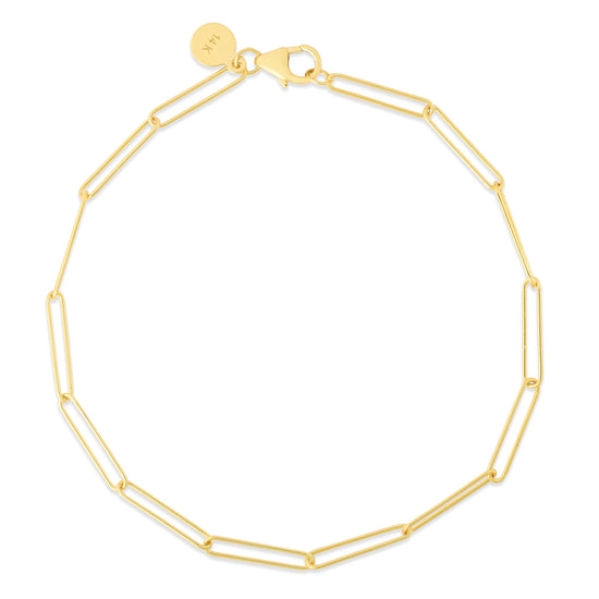 | Description | 14K Yellow Gold 7" Lungo Paperclip Chain Bracelet with Pear Shaped Lobster Clasp. |