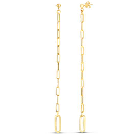 | Description | 14K Yellow Gold Paperclip Shoulder Duster Drop Earrings. Total drop length measures approximately 114mm. |
