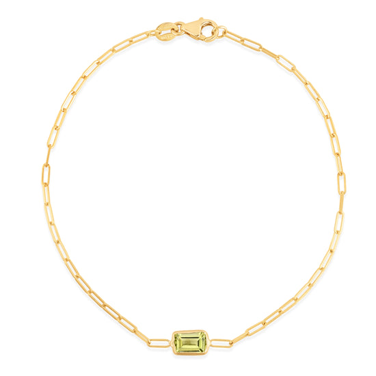 | Description | 14K Yellow Gold 7" Gemstone Paperclip Bracelet with Lobster Clasp, featuring 6x4 baguette Peridot center element. |