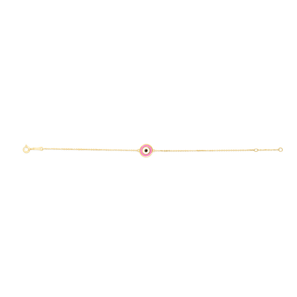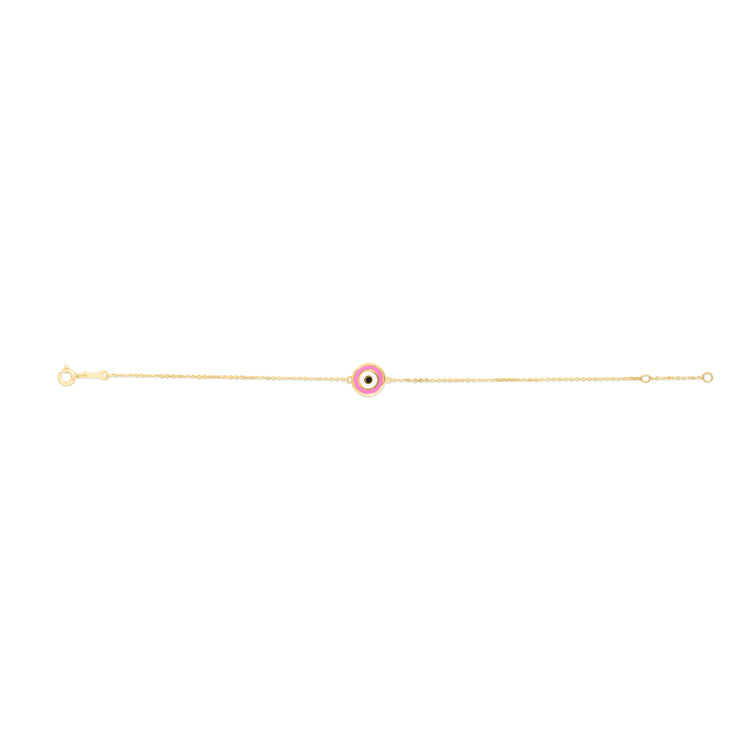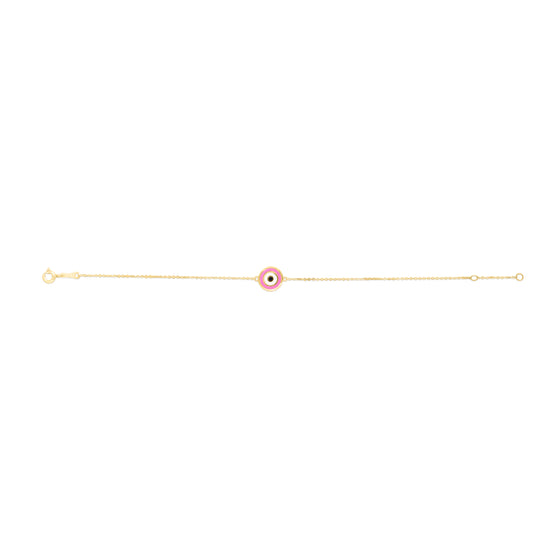 | Description | 14K 7" Yellow Gold Round Pink Enamel Evil Eye Bracelet with Spring Ring Clasp. Jump ring at 6.25" |
