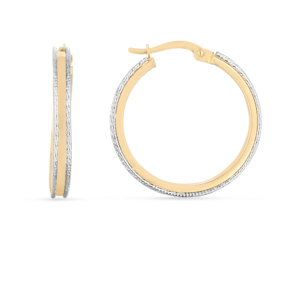 Description | 14K Two-tone Gold Polished and Diamond Cut Round Hoop Earrings with Hinged Clasp |