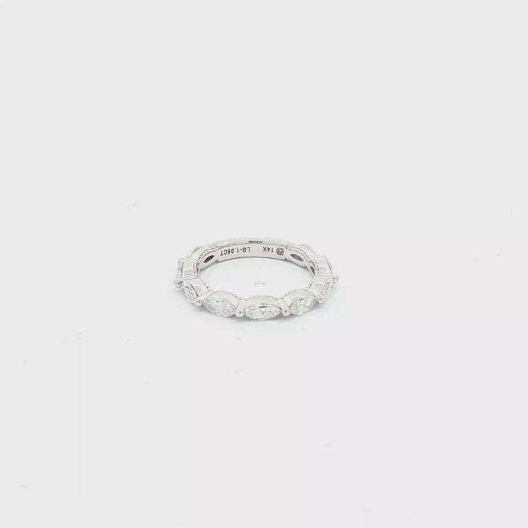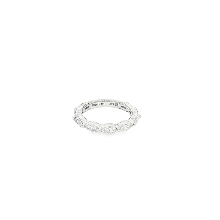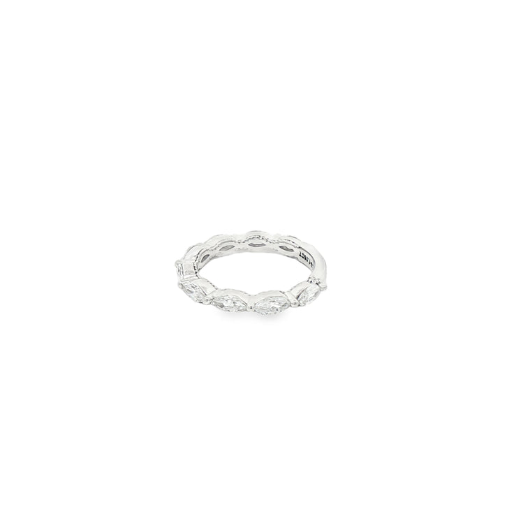 This sophisticated eternity band features a continuous row of marquise brilliant cut diamonds, meticulously set in 14K white gold. Each diamond displays exceptional transparency and polish, arranged horizontally to create a seamless circle of brilliance. The delicate milgrain detailing on the settings enhances the vintage-inspired aesthetic of this high-polish, multi-stone composition.